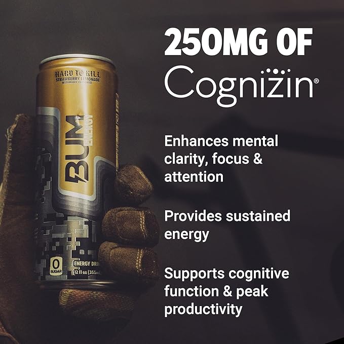 - Bum x GBRS Hard To Kill Energy Drink: This collaboration with Global Battlefield Research Solutions is dedicated to the brave men and women who put their lives on the line to protect our country. Bum Energy is made with stimulating natural caffeine and brain-boosting Cognizin, a dynamic duo that will deliver clean energy and sharpened focus. 12-pack of 12-oz cans.