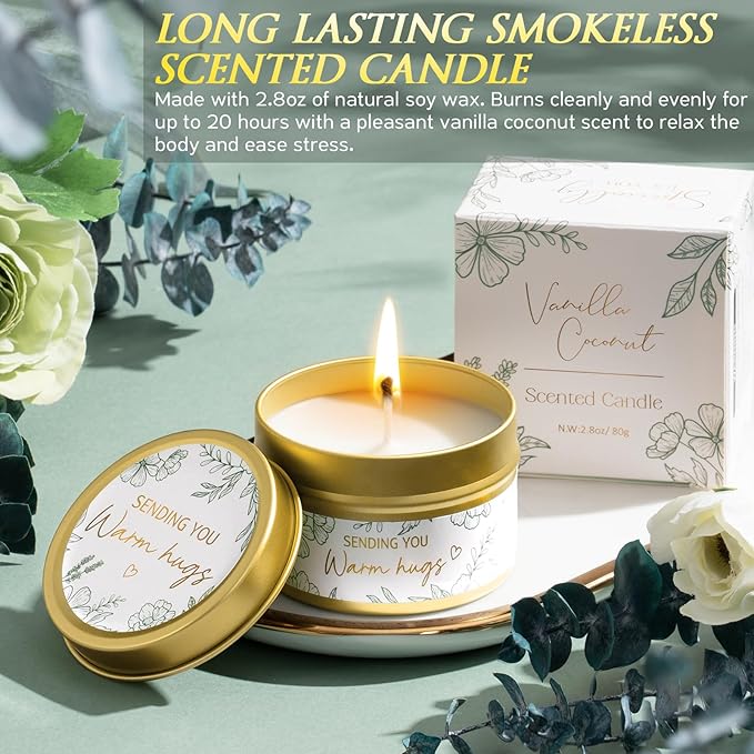 - RELAXING SPA GIFT BASKETS FOR WOMEN: The spa kit for women gift set features a 2.8oz vanilla coconut soy candle with up to 20 hours of burn time, paired with matching bath salts and handmade oatmeal soap—designed to relax her body, calm her mind and brighten her mood. This caring spa gift baskets for women relaxation gifts birthday gifts for women mom sister care package for women after surgery is a gentle expression of care, quietly delivering love, support, and strength when she needs it most