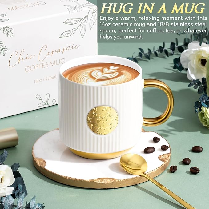 - ELEGANT CERAMIC MUG WITH SPOON: This elegantly designed mug printed with “Hug in a Mug” is made of premium ceramic that is both durable and heat-resistant—perfect for enjoying hot coffee, tea, or any beverage with peace of mind. The sturdy handle offers a comfortable grip, and the 18/8 stainless steel spoon adds a touch of elegance. Ideal for a peaceful morning or a cozy evening moment. A heartfelt care package for women self care gift relaxing comfort gift sending big hug gifts feel better gift