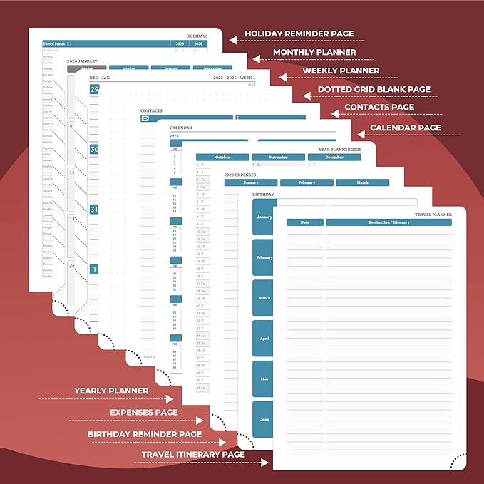 - Thoughtful Design: The monthly tabs on the side of the agendas planner can easy locate the current date; the tear off design and bookmark rope make it easy to flip through the medium planner. The last page of the 2026 college planner has an expanded inner pocket that has a small space for storage of cards