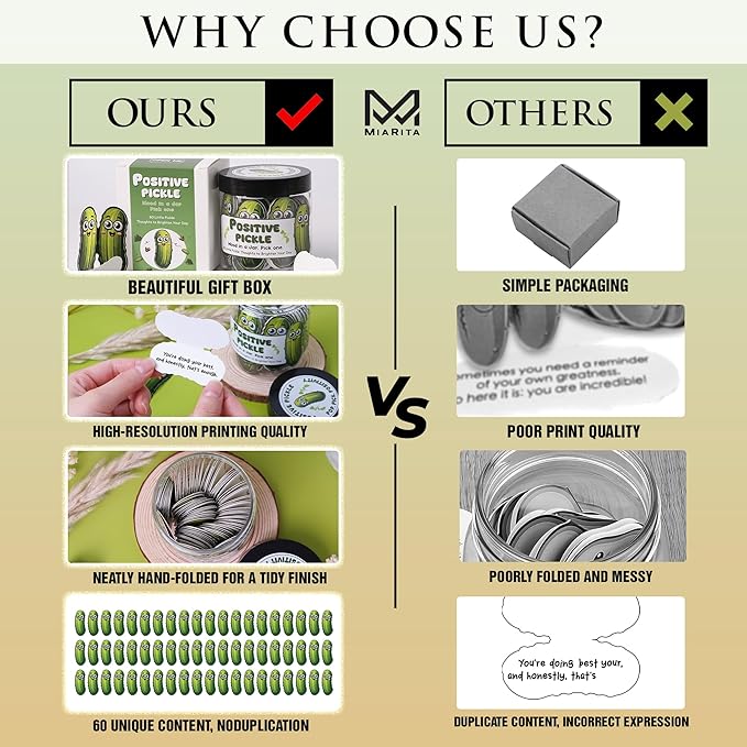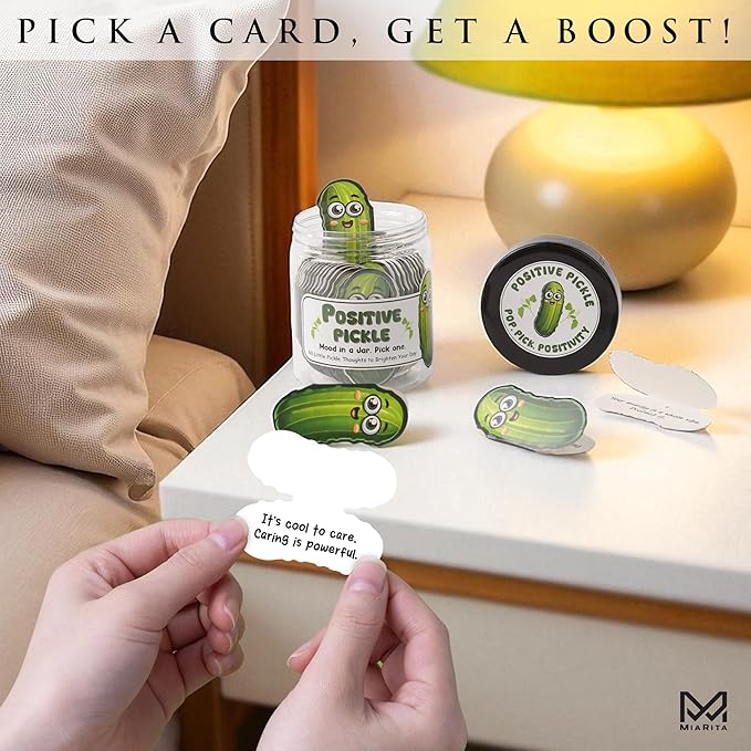 - 📖 Easy Daily Positivity Ritual: Just pick a card, unfold, and let the pickle wisdom brighten your day. Use them as desk décor, tuck them into journals, or share with friends, these affirmation cards make positivity fun and effortless.