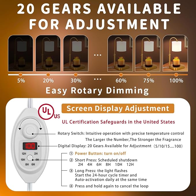 - [Smarter Timers and Loop Functions] The candle lamp warmer with timer and cycle timing.We have set a timing function for the lamp candle warmer in 5 time periods, namely 2/4/6/8/10 /12 hours.And you can set a 24-hour cycle timer. Today it will turn off at the time you set, and turn on the light at the same time the next day.Precise temperature and time control to create a perfect atmosphere that suits your preferences, allowing you to easily enjoy the good mood brought by the fragrance.