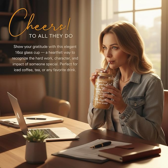 - Elegant Gift Set with Inspirational Items: Includes a 16oz glass tumbler engraved with the uplifting quote "May you be proud of the work you do, the person you are, and the difference you make", complete with a stainless steel straw, lid, and brush. A premium Difference Maker Definition journal (5.7"x8.26") with 200 lined pages provides the perfect space for daily reflections, planning, or self-care journaling.