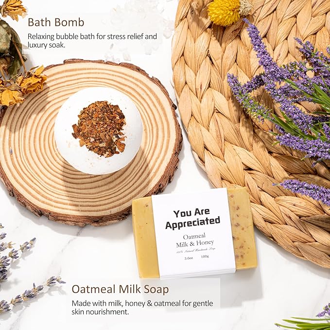 - Thank You Pampering Self-Care Gifts: This curated collection features a lavender-scented candle with the comforting message “Never forget the difference that you make, thank you”, a handcrafted You Are Appreciated oatmeal milk & honey soap, a fresh mint lip balm, and a rose-scented bath bomb topped with a Beyond Grateful sticker—offering a spa-like relaxation experience at home.