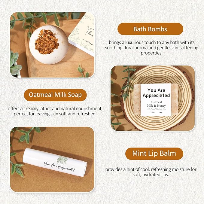 - Comforting Scents & Thoughtful Self-Care Essentials: Delight your recipient with a lavender-scented candle featuring the words “Best Team Definition”, a creamy Oatmeal Milk & Honey soap bar printed with “You Are Appreciated”, a refreshing mint lip balm with logo, and a lemon-scented bath bomb —bringing joy and relaxation after a long day.