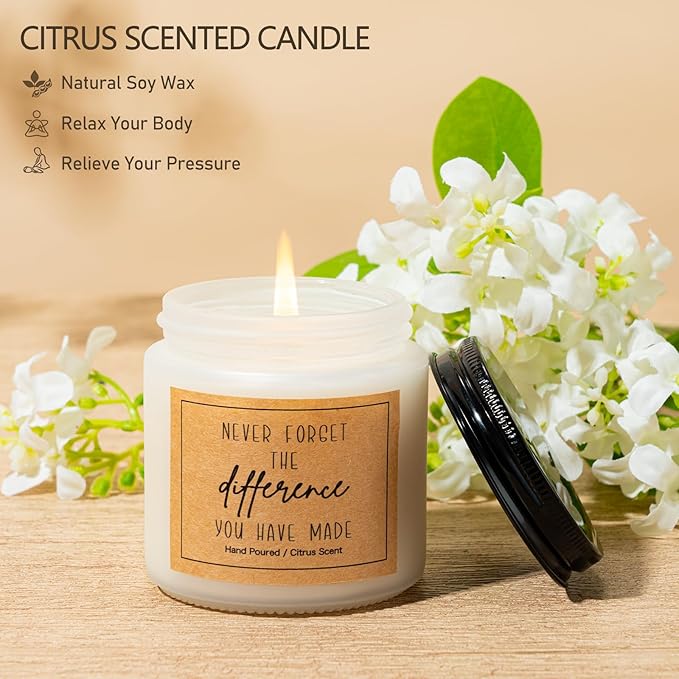 - Citrus Scented Candle with Encouraging Quote: Uplift their day with the fresh and clean citrus-scented candle printed with “never forget the difference you have made.” Ideal for any workspace, home, or classroom—adds warmth and positivity to any environment.