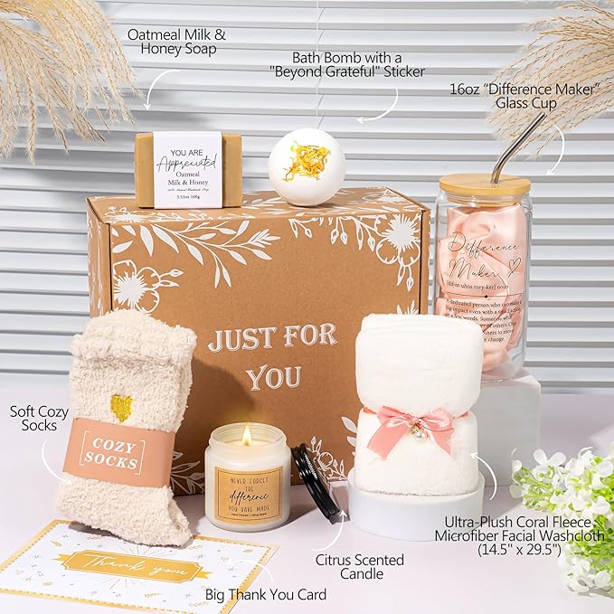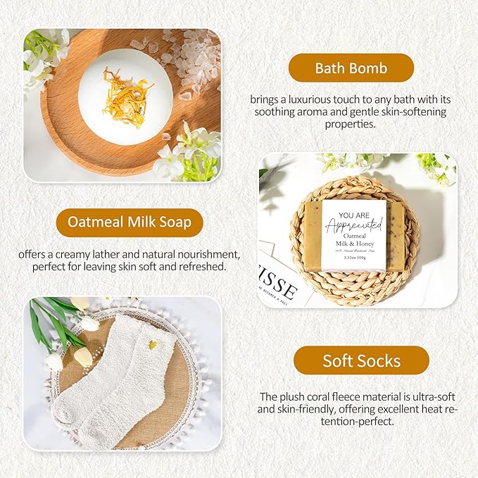 - Spa-Inspired Comfort & Self-Care: Includes a coral fleece facial washcloth, cozy socks, oatmeal milk & honey soap, and a rose bath bomb with “beyond grateful” stickers—everything they need to relax, unwind, and feel appreciated.