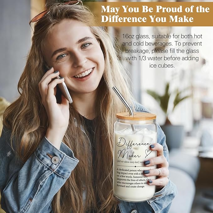 - 16oz “Difference Maker” Glass Cup: This elegant glass cup features the uplifting message “Difference Maker” serving as a daily reminder of their impact. Whether used for coffee, tea, or water, it’s both practical and inspiring.