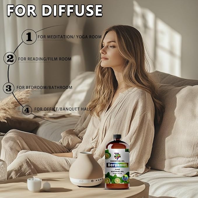 - METHOD AND USE RANGE:Mix Bergamot Essential Oil with water (recommended ratio is 1:10) and add a few drops into an aroma diffuser to create a relaxing and pleasant atmosphere; it can also be used to make candles, soaps, lotions, and homemade cleaning products; Other Applications: humidifiers, aroma diffusers, home spa treatments, cleaning products, massages, yoga, and automotive diffusers