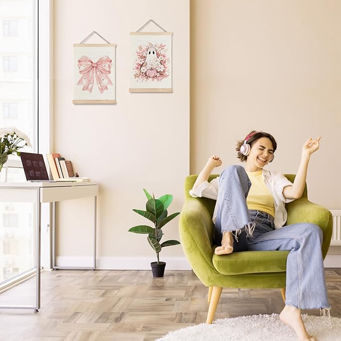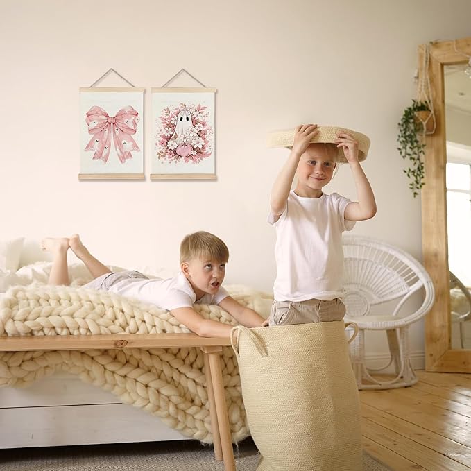 Exqcom Coquette Pink Bow Floral Halloween Ghost Wall Decor Set of 2, Preppy Pink Fall Pumpkin Floral Wall Art Poster, Halloween Ghost Posters for Girly Room Bedroom Dorm Apartment Home, 12x16 Inches