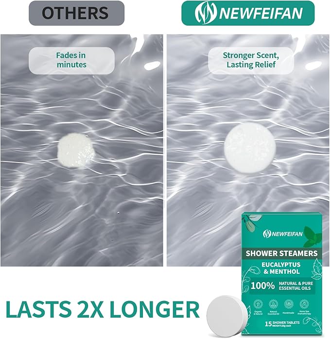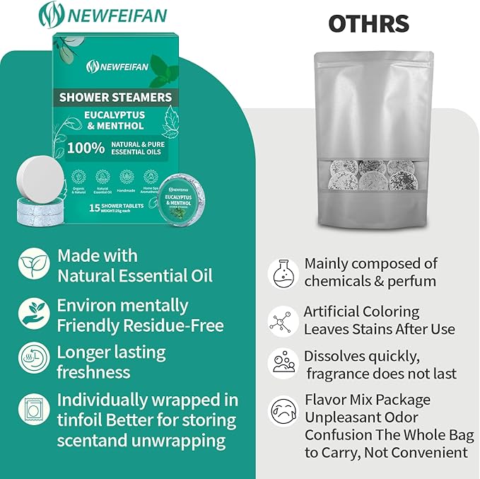 - [ECO-FRIENDLY AND RESIDUE-FREE, EASY TO USE] Take out a piece of shower steamers in aluminum foil and place it in the corner of the shower where the water flow is light, for best results, do not submerge the shower bombs, or put the shower bomb in a yarn bag and hang it up to rins. The intoxicating aroma takes you into a state of relaxation, NEWFEIFAN shower steamers dissolve completely without residue and are non-slip, so they won't clog your home's drainage system