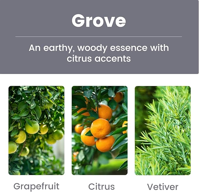 - GROVE: An earthy, woody essence with citrus accents. The initial burst of zesty bergamot and bitter orange leaves is both energizing and uplifting. It gracefully transitions into a heart where warm nutmeg and orange blossom meet crisp citrus. The experience is grounded by an earthy, robust base of musk, amber and cedarwood.