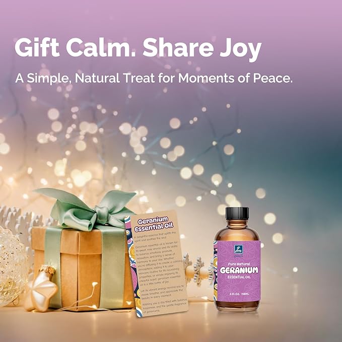 - 100% Pure Geranium Essential Oil: Premium 4oz geranium essential oil, steam-distilled from fresh geranium leaves. Perfect for diffuser, skin, hair, face, and aromatherapy uses.