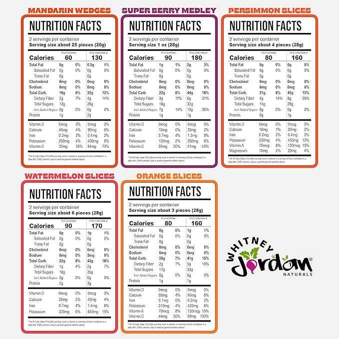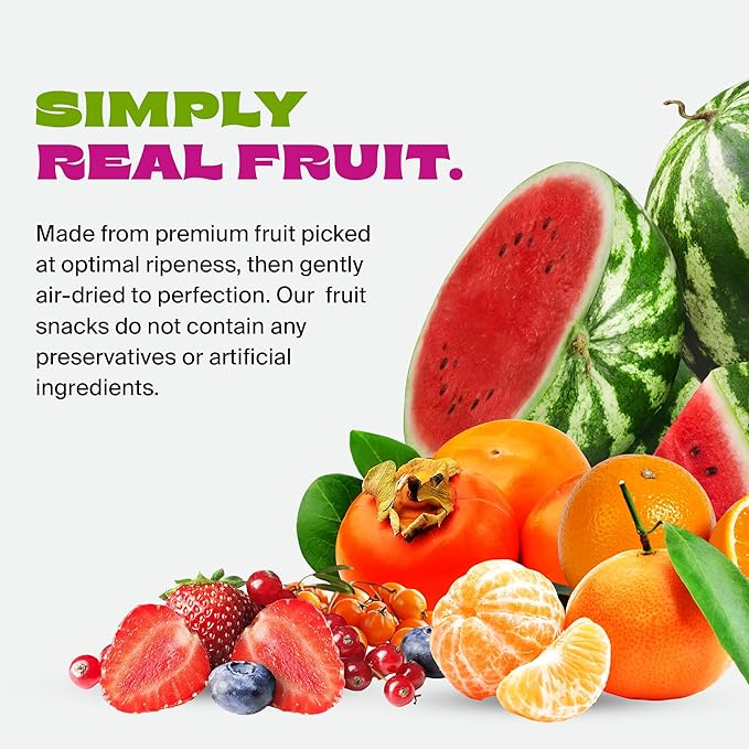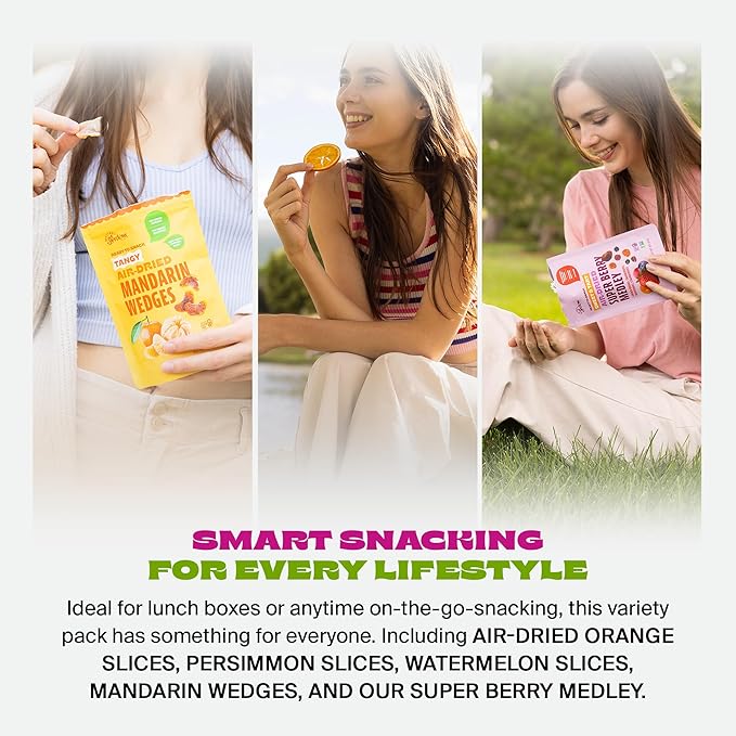 - Bold Mix of Fruit: Enjoy a vibrant mix of dried fruits. Packaged separately, this variety pack includes air-dried watermelon slices, persimmon slices, orange slices, super berry medley, and mandarin wedges. This healthy snack variety pack delivers bold flavor and real fruit in convenient, single-serve bags, ideal for lunches, travel, or snacking on-the-go.