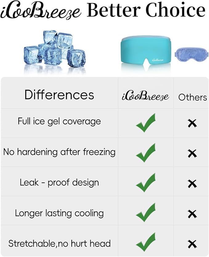 - ★WHY CHOOSE US?The iCooBreeze cooling eye mask is crafted with ultra-thick, non-toxic gel. The gel is evenly distributed, soft, and flexible—it never hardens or leaks, even after freezing. It stays cool for extended periods and is fully reusable.