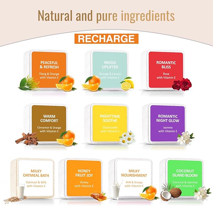 - Various Scents: Infused with natural essential oils. Includes Ylang, Orange, Lemon, Rose, Cinnamon, Chamomile, Jasmine, Coconut, Oatmeal, Milk, Honey, and more. Each Shower Steamers is individually wrapped, making it an essential item for relaxation during travel.