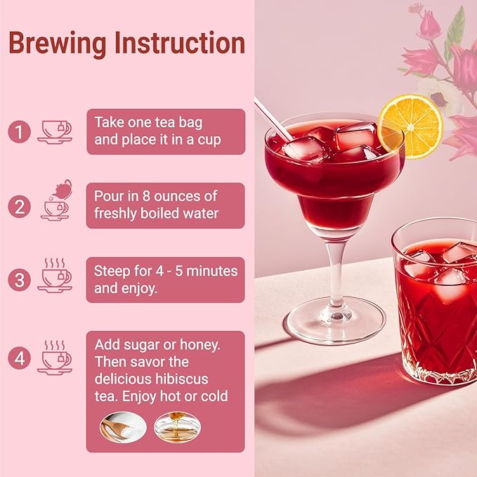 - Enjoy HibIscus Tea:Precisely proportioned hibiscus petals unleash a vibrant flavor in just minutes. Simply steep organic hibiscus tea in hot water for 5 minutes. Adjust the sweetness to taste or add ice cubes to experience the unique flavor of whole hibiscus petals, or use in smoothies and cakes for a delightful taste.