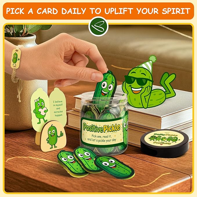 - Funny Pickle Gifts For Pickle Lovers: 1 jar for holiday gifts, 60 daily affirmations for women desk accessories, 1 affirmation bracelets, 1 stand. Filled with positive affirmations cards, and motivational cards that speaks to the heart-this is the ultimate bundle of encouragement cards for women or encouragement gifts for women