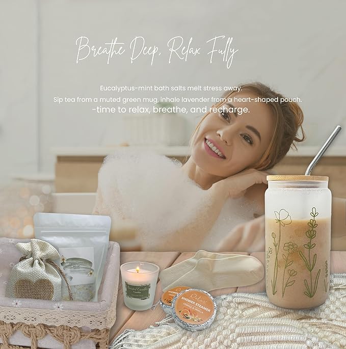 - 3.Comfort in the Smallest Details Includes soft ivory socks to warm the feet, a lavender heart sachet for a relaxing touch, and a frosted glass cup with a serene botanical design — combining beauty and comfort in one gift.