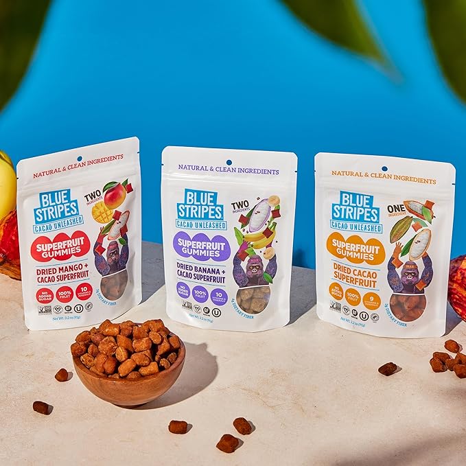 Blue Stripes Cacao Superfruit Gummies - Vegan Chewy Fruity Snack, No Sugar Added 100% Fruit Gummy, 9 Essential Vitamins & Minerals, Natural Tropical Superfood - Pineapple & Cacao, 3.2 oz (2 Pack)