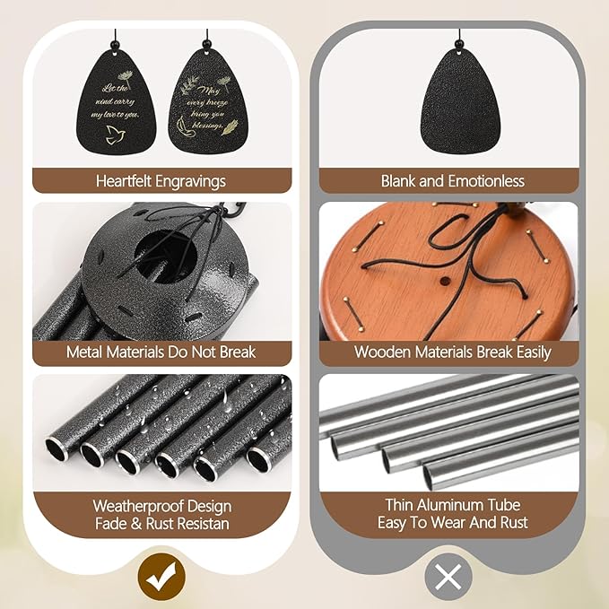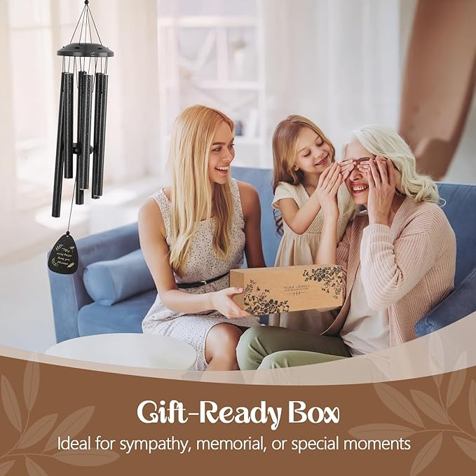 - âïž Built to Last Through Every Season: Made with virgin aluminum alloy, corrosion-resistant nylon string, and a fade-proof matte black finish, this large chime is weatherproof and durable. Rain or shine, it stays beautiful and resonantâbecause a meaningful gift should last as long as the memories it honors.
