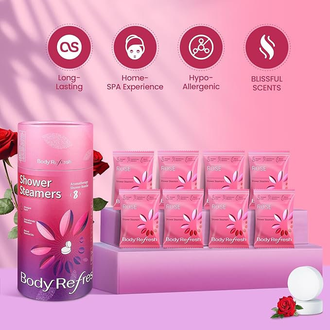 - Long-Lasting and Potent Aroma - Each set contains 8 tablets in the elegant and romantic scent of Rose. Infused with natural rose essential oil to uplift the mood and soothe the senses—each shower steamer helps ease stress and inspire moments of tenderness. Allow the delicate floral aroma to envelop your senses and create a luxurious, spa-like atmosphere in your shower. Ideal as spa and self-care gifts for women.