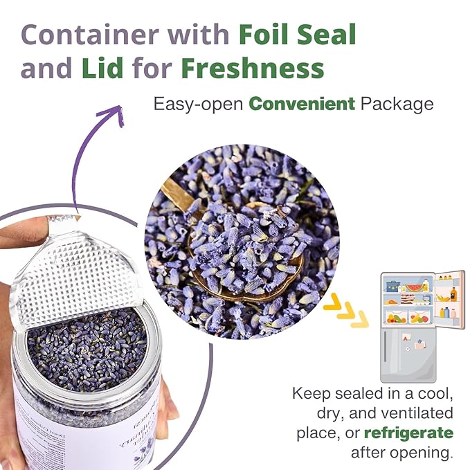 - 【Smart Storage, Fresh Flavor】Comes in a resealable canister to keep lavender buds fresh. Keep sealed in a cool, dry, and ventilated place, or refrigerate after opening. Great value for home use, special events, weddings, or gifting to lavender lovers. Our lavender petals may contain tiny natural stems and leaves, these are a natural source of fragrance and do not affect quality or use