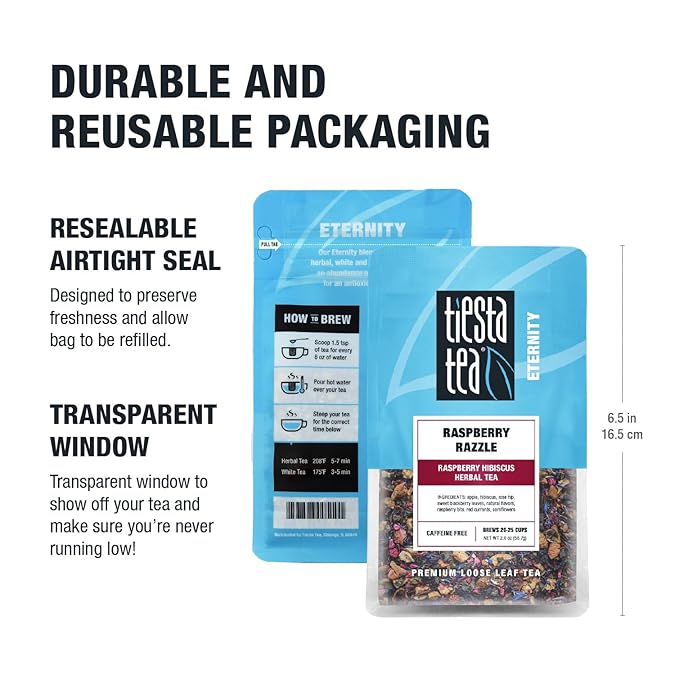 - RESEALABLE, REUSABLE TEA POUCH: No matter where life takes you, Raspberry Razzle Herbal Tea is there to refresh you. Whether you’re at home, at work, or on-the-go, enjoy this delightful, fruity blend in a bulk pouch, sleek tin, or portable pouch—perfect for satisfying your cravings whenever and wherever you need a burst of flavor.