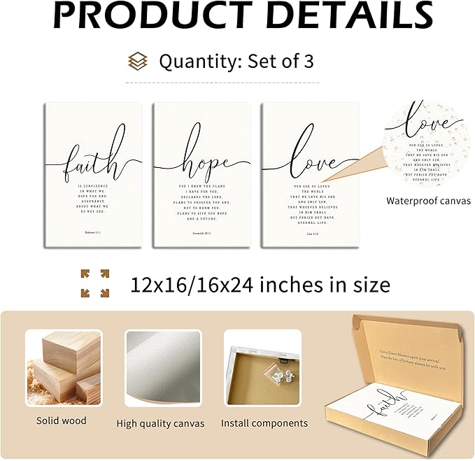 - 【Inspirational Christian Wall Art】: This 3-piece Faith Hope Love canvas print set features uplifting Bible verses from Hebrews 11:1, Jeremiah 29:11, and John 3:16 to bring faith and encouragement into your space.