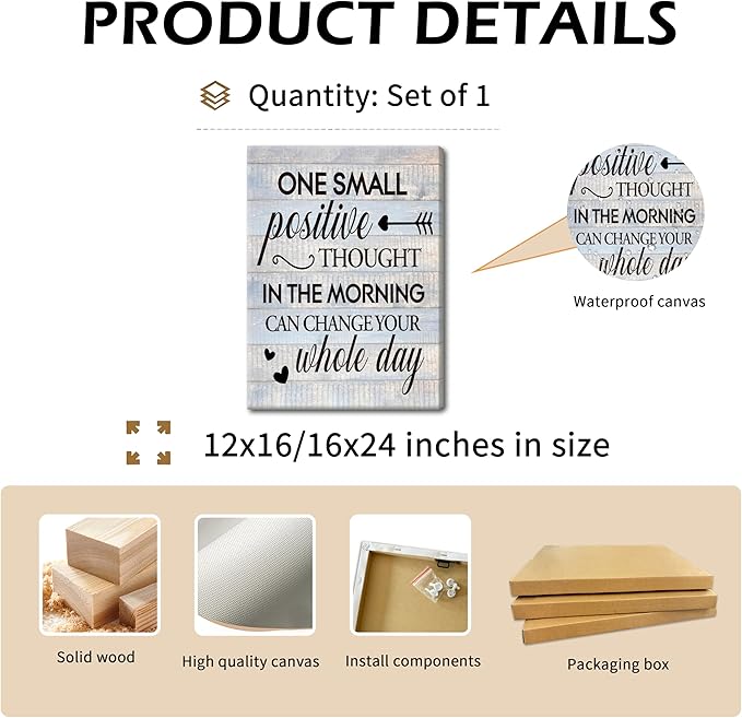 - Farmhouse Style Inspirational Wall Decor – Rustic wood-grain background with elegant typography delivering a motivational quote: "One Small Positive Thought in the Morning Can Change Your Whole Day." Perfect for farmhouse, rustic, or modern home aesthetics.