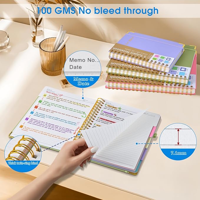 - Aesthetic 5 Subject Notebook:Our spiral notebook gorgeous designed with bright colours, gold foil lettering and metal corners forming a sturdy yet charming cover. Durable waterproof cardboard protects important notes and provides soild support for handwriting. Twin-ring binding easy opens flat to 180° without tearing apart,provide a comfortable writing experience. perfect for notebooks for work, school or daily notes, this hardcover spiral notebook is a reliable writing companion.