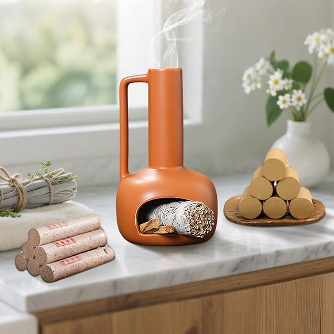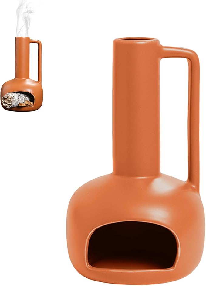- Crafted From Handmade Ceramic : Our incense holder is uniquely vase-like shaped, with handles for easier holding. The beautifully polished chimney design can directs aromatic smoke upward, which also serves as a fireplace for burning palo santo, sage and incense cones