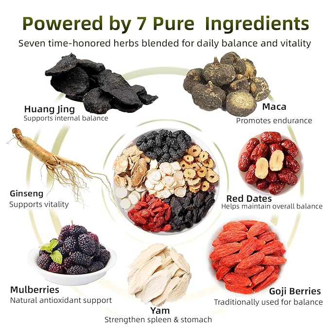 - 7 Real Ingredients, No Additives:This ginseng six treasure tea features ginseng, goji berries, red dates, mulberry, maca, yam, and huang jing—naturally dried, caffeine-free, sugar-free, and crafted for your daily kidney tea routine