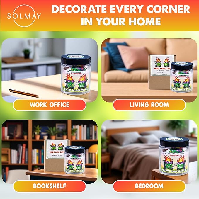 Positive Dumpster Fire Jar ā Funny Desk Accessory with 60 Daily Affirmations for Self Care & Mindfulness, Emotional Support Dumpster Fire Gift for Office Coworkers, Unique Zen Desk Decor