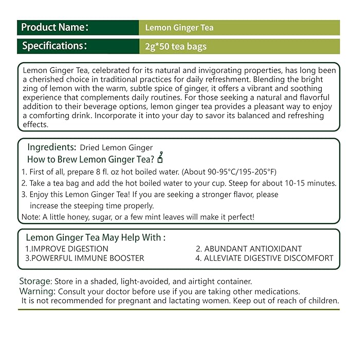 - Health Guardian: Crafted from nature's finest, lemon ginger tea offers a comforting blend rich in natural goodness. Its nutrient-rich profile supports overall wellness, helping to soothe occasional discomfort and promote gentle digestive care—making it a thoughtful addition to your daily routine.