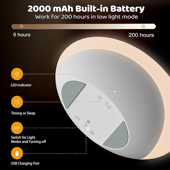 - Rechargeable Long Endurance night light:Cordless LED night lamp powered by a built-in rechargeable 2000mAh battery, can glow last 6 (highest brightness) -200 hrs (dimmest brightness) working time once fully charged.