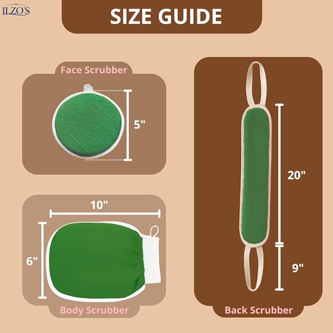 Original Moroccan Kessa Exfoliating Glove Set (ILZO’S) – 3-Piece Hammam Mitts for Face, Body & Back – Deep Skin Cleansing & Dead Skin Removal – Reusable Natural Exfoliator – Assorted Colors (GREEN)