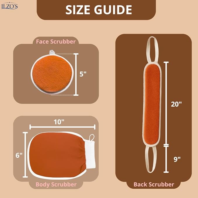 Original Moroccan Kessa Exfoliating Glove Set (ILZO’S) – 3-Piece Hammam Mitts for Face, Body & Back – Deep Skin Cleansing & Dead Skin Removal – Reusable Natural Exfoliator – Assorted Colors (ORANGE)