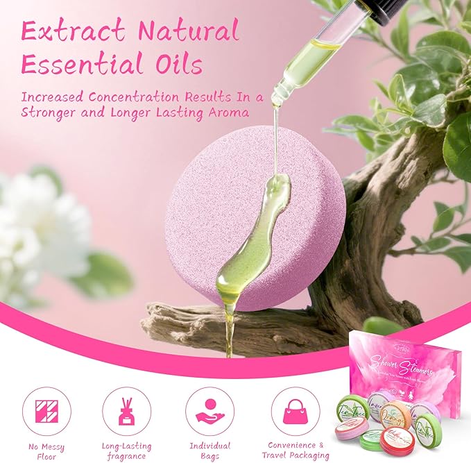 - 【Enduring and Soothing Aroma】Our Shower Steamers are made with natural ingredients and plant essential oils,crafted without any chemical additives, ensuring they are non-irritating and hypoallergenic, making them suitable for all skin types. Through continuous upgrades and improvements, we have enhanced our shower steamers to emit a fresher, richer, and longer-lasting fragrance than others. Enjoy a shower that helps you relieve the stress and fatigue of the day