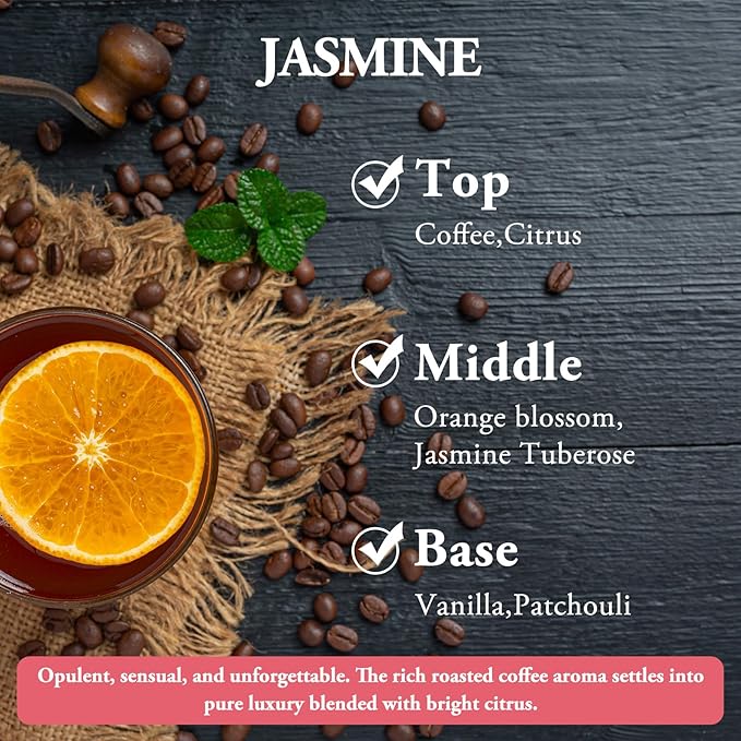 - JASMINE: Opulent and rich Coffee scent —a sophisticated blend that begins with rich roasted coffee and bright citrus, transitions into a floral heart of orange blossom, jasmine, and tuberose, and deepens into a warm base of vanilla and patchouli. This sensual scent adds a touch of luxury to any environment.