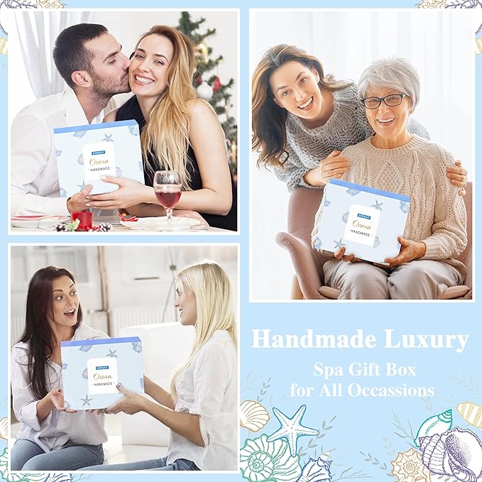 - HANDCRAFTED SPA GIFTS FOR WOMEN: Our Ocean Spa Gift Box has everything a woman needs! The gifts baskets include: Hand Cream, Body Lotion, Body Scrub, Essential Oil, Bath Salt, Handmade Soap, Scented Candle, Bath Bomb, Cotton Linen Soap Bag, Pampering Door Hanger Sign, Greeting Card, Gift Box.