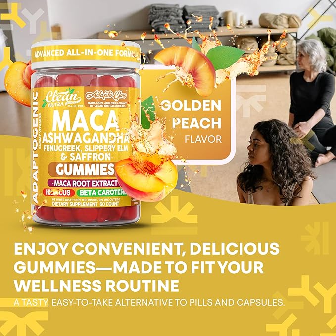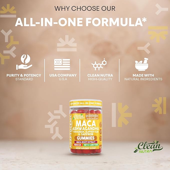- Advanced maca root adaptogenic beauty nutrition combo for women and men: Clean Nutra fuses Maca, Ashwagandha, Fenugreek, Slippery Elm, Saffron, Hibiscus, and our AdaptoGlow complex into irresistibly juicy gummies. Each serving floods your system with antioxidant-rich beta carotene plus naturally occurring vitamin a to encourage radiant skin, stronger hair, and resilient nails, while helping combat daily oxidative stress, environmental aggressors, and nutrient gaps for renewed vitality.