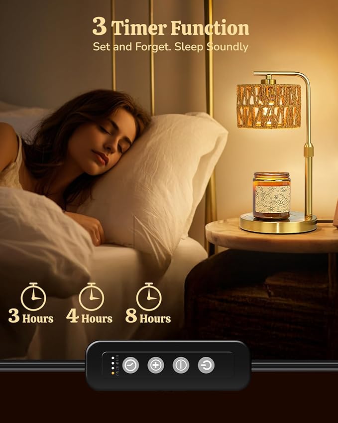 - 【Flame-Free, Timing Function】Say goodbye to open flame hazards and protect the safety of you, children, and pets at home. Candle warmer features a timing function (2/4/8 hours) and an auto-off function, ensuring it automatically turns off after the set time. Especially suitable for small spaces like bedrooms, offices, and dormitories, allowing you to enjoy candlelight while feeling safe.