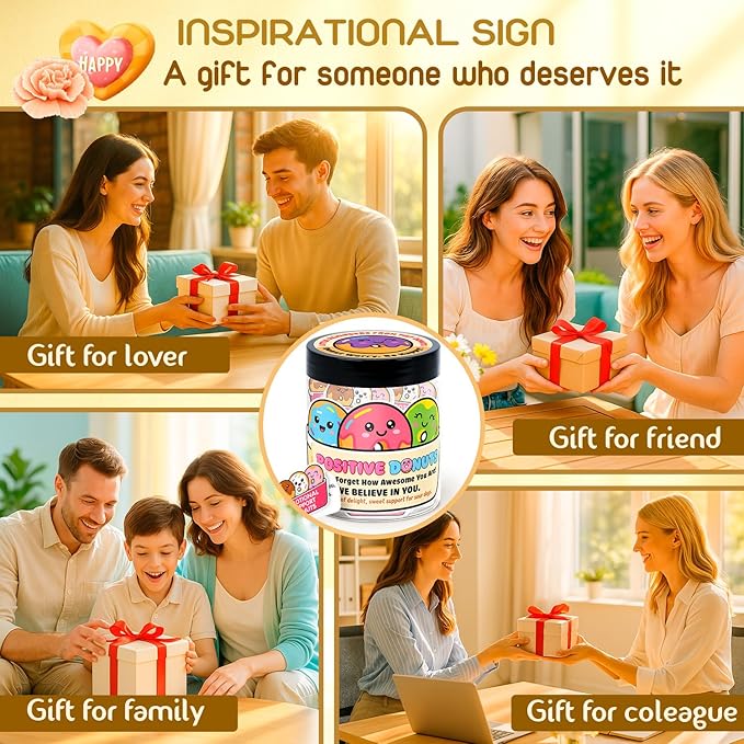 - READY-TO-GIFT JAR FILLED WITH POSITIVITY This donut-themed gift includes 60 uniquely designed cards, each printed with a cheerful message to brighten someone’s day. The jar is beautifully packed and ready to gift—no wrapping required! Whether used as a positive gift for women, a donut lover gift, or a light-hearted mental health support idea, it’s the perfect treat for those who need daily doses of kindness and joy.