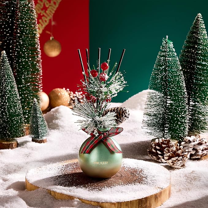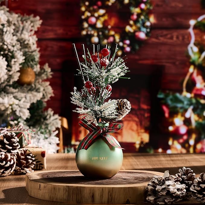 - An exquisite creation awaits you: a distinctive spherical reed diffuser bottle with 5.7oz diffuser oil, complemented by a fruit-laden pine branch, a pinecone, A beautiful ribbon and 8 reed diffuser sticks. Long after the contents have evaporated, this vessel will stand as a charming adornment to your space.