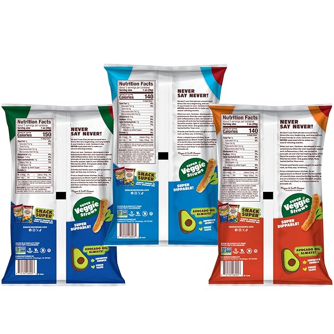 - FAMILY-CRAFTED FLAVOR IN EVERY BAG Born in a family kitchen and now a fan favorite across the country, Jackson’s Super Veggie Straws are made for snackers who want it all—clean ingredients, crave-worthy flavor, and bold crunch. Each veggie straws pack includes three crowd-pleasing flavors to satisfy every craving. Whether you’re building a pantry of healthy snacks or reaching for a tasty snack variety pack, this trio offers flavor-forward snacking you can count on.