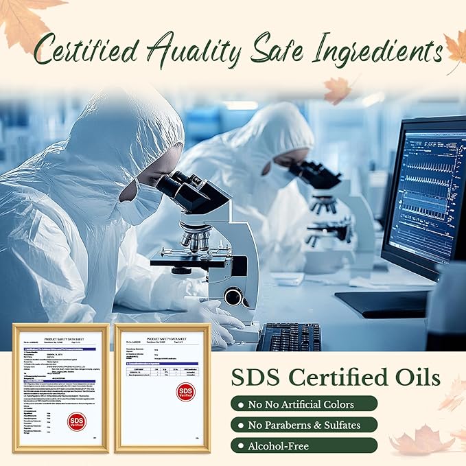 - 🛡️【SAFE & PURE INGREDIENTS】Our Fall Essential Oils for Diffuser are crafted with natural, non-toxic ingredients and are free from synthetic fragrances or harmful chemicals. Each essential oil is backed by SDS-certified safety data, ensuring peace of mind for you and your family.These fall scented essential oils are family- and pet-friendly, letting you enjoy the warm, rich autumn atmosphere with complete peace of mind