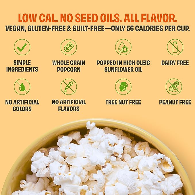 - LOW CALORIE & VEGAN FRIENDLY — With only 56 calories per cup, this low calorie popcorn is perfect for healthy snacking. It’s vegan, gluten-free, dairy-free, nut-free, kosher, and made for mindful munching.