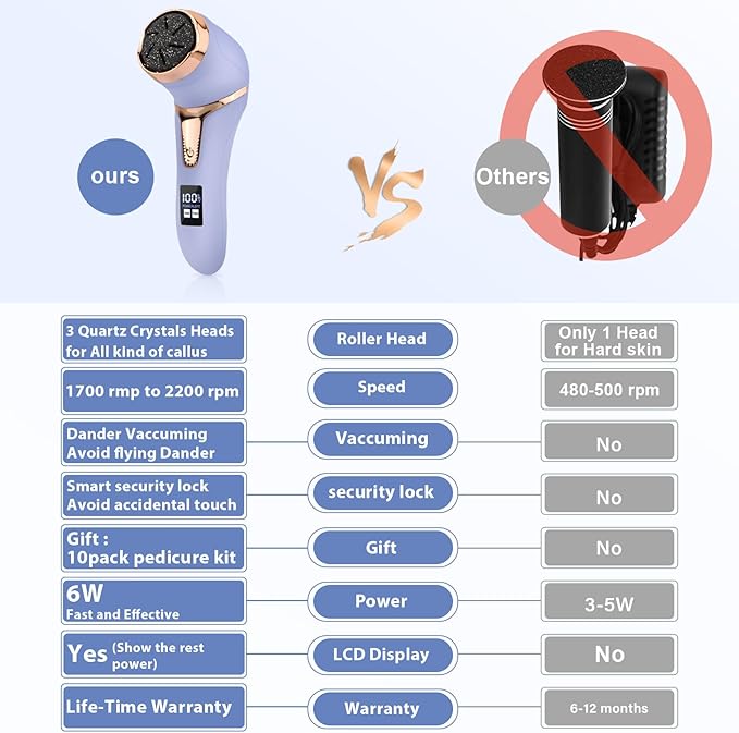 - Pedicure kit with 9 Grinding Head, 2 Speed, with VACUUM ABSORPTION----- 9 Quartz Crystals Removable Roller Heads and 2 Speed Correspond to the roughness required to remove the calluses on the feet. UPGRADE powerful callus remover with dander vacuum cleaner quickly sucks away foot scraps, cle.an and hygienic, and sucks while grinding. dust-free, and foot scraps will not be scattered in air or floor, an essential home pedicure kit for people who has cleanliness.
