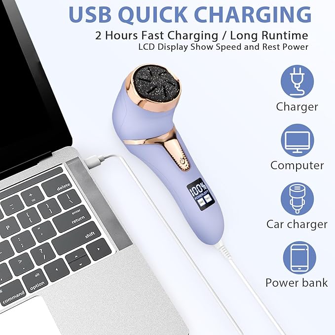 - Rechargeable, Long-Lasting, Easy to Use ----Included USB charging cable, This electric foot file can be charged via any USB port, and have a long runtime 2hours after full charged .and this dead skin remover for feet have LCD Power display let you clear know the rest power it left. remind you charge in time